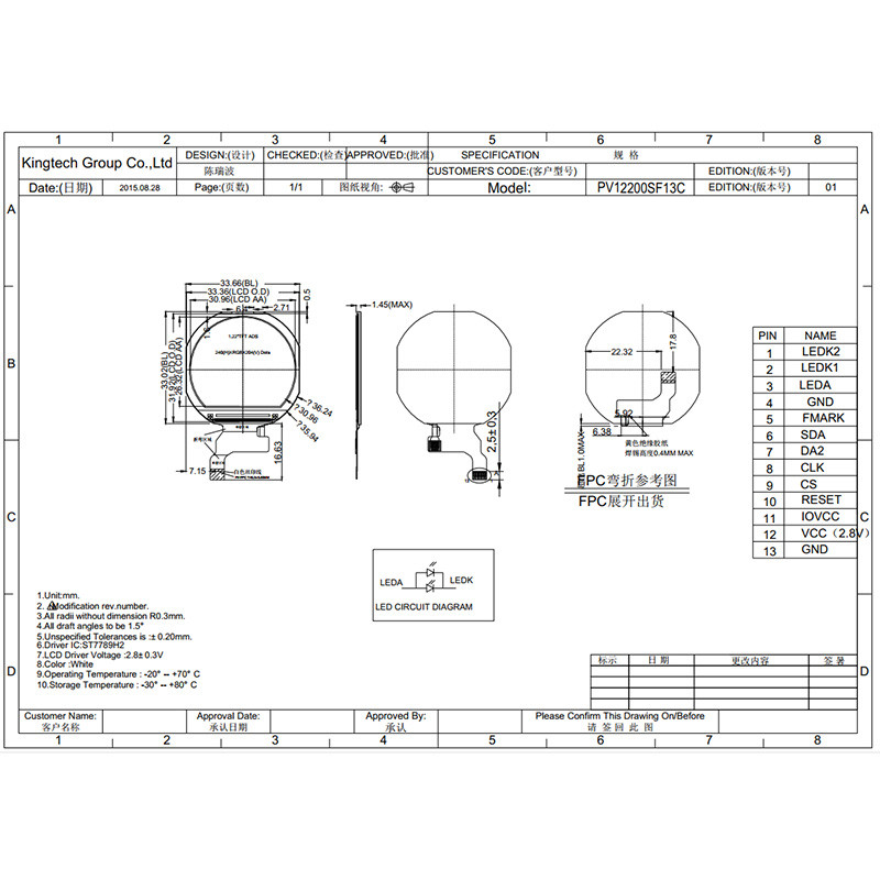 Kingtech 1,22 tums 240 * 204 TFT rund modul display försörjning är mycket stabil. Denna 1,22 tum stöder 3-linjers SPI Interface. Dessutom är 1,22 tums TFT-skärmmodulens ljusstyrka 150 nits, och denna 1,22 tums skärm är All/Free/Wide betraktningsvinkel/IPS typ. För beröringsdelen kan vi också anpassa kapacitiv beröring enligt kunden' s krav.